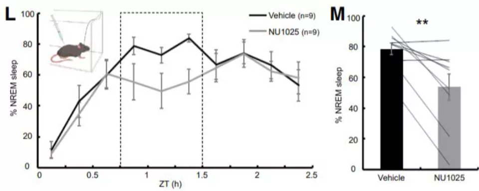 为了进一步确认在斑马鱼上的研究结果,研究者与特拉维夫大学的 Yuval Nir 教授合作,使用脑电图在小鼠上检测了 PARP1 在调节睡眠中的作用。与斑马鱼上得到的结果相同,PARP1 活性的抑制降低了非快速眼动睡眠的持续时间和质量。这说明PARP1能够告诉大脑它需要睡眠,否则它将面临危险。