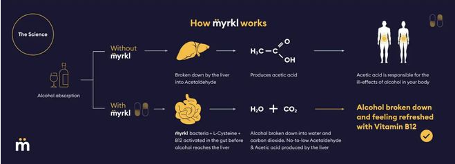 在这种情况下,获得一种安全的方法,并抑制摄入的酒精吸收到血液中可能是防止酒精引起的器官损伤的有效方法。瑞典益生菌公司DeFaire Medical开发开发了一种益生菌营养补充剂---Myrkl,它由芽孢杆菌菌株组成,另外还添加了L-半胱氨酸和维生素B12及其他零碎的东西如发酵米糠、糊精、脂肪酸镁盐和磷酸钙等。